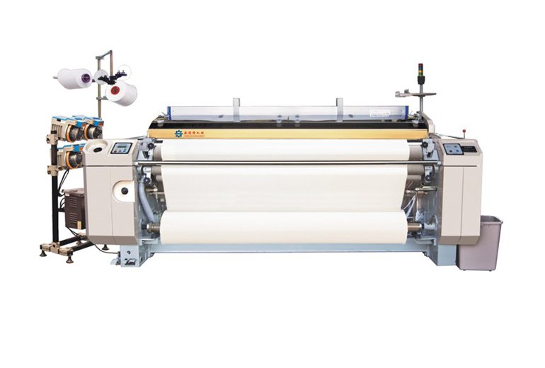 SDL408系列四喷喷水织机喷水织机,产品适应广泛,尤其是高密度、高克重,超细织物,且具有更加高速、高效、超稳定运转能力。本机型可选配机械储纬、电子储纬、多喷、凸轮开口装置、多臂开口装置。